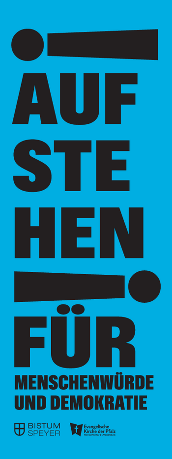 Die Initiative "Aufstehen für..." ist ein gemeinsames ökumenisches Projekt des Bistums Speyer und der Evangelischen Kirche der Pfalz mit Fahnen, Postkarten und einer Social Media Kampagne. Die Fahnen mit dem Slogan "Aufstehen für Menschenwürde und Demokratie" werden im gesamten Bistumsgebiet gehisst und zeigen, dass wir als Christinnen und Christen zusammenstehen. Mit unseren Sticker-Postkarten informieren wir über die Initiative, möchten aber vor allem dazu beitragen, die Welt ein bisschen bunter zu machen und unser Anliegen so in der Welt zu verbreiten. Die Postkarten bekommen Sie zum Beispiel in Ihrer Pfarrei vor Ort.