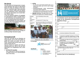 Bildung ist der Schlüssel zur Zukunft. Sehr zielgerichtet wendet die Kirchengemeinde im kongolesischen Mukulakulu diesen Schlüssel an: Neben der ständigen Weiterentwicklung der Schule (Unterricht bis zum Abitur) fördert der Verein FePaGri die Ausbildung von jungen Landwirtschaftsschüler/innen und ermöglicht den Dorfbewohnern durch eine Saatgutbank, Schulungen und Werkzeugverleih Hilfe zur Selbsthilfe.