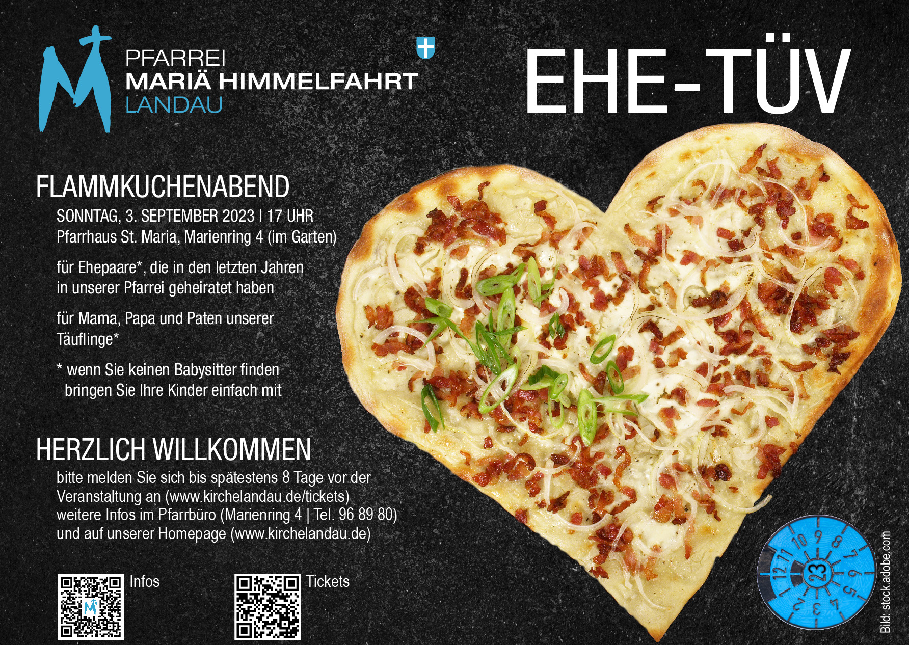 Pfarrer Axel Brecht lädt die Ehepaare, die in den letzten zehn Jahren in seiner Pfarrei den Bund der Ehe geschlossen haben, zu einem "TÜV-Termin" ein. Damit es keine allzu trockene Übung wird, wird die Begegnung mit anderen Ehepaaren und seinem Team am Steinbackofen im Pfarrgarten stattfinden. Die Ehepaare werden gebeten, das Lieblings-Hochzeits- oder Familienfoto, ein kleines Symbol des gemeinsamen Weges, einige gute Erinnerungen sowie Appetit mitzubringen.