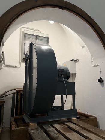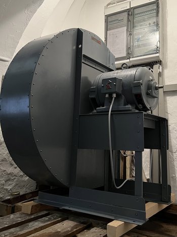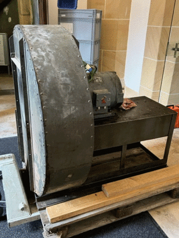 "Das Gebläse wird bedient durch einen Hochdruckventilator, der 65 cbm. Presslutt in der Minute liefert und so vollständig seinem Zwecke nachkommen kann. Antrieb ist ein Gleichstrommotor mit 4 P.S. und 1400 Minutenumdrehungen, 220 Volt , leistend."